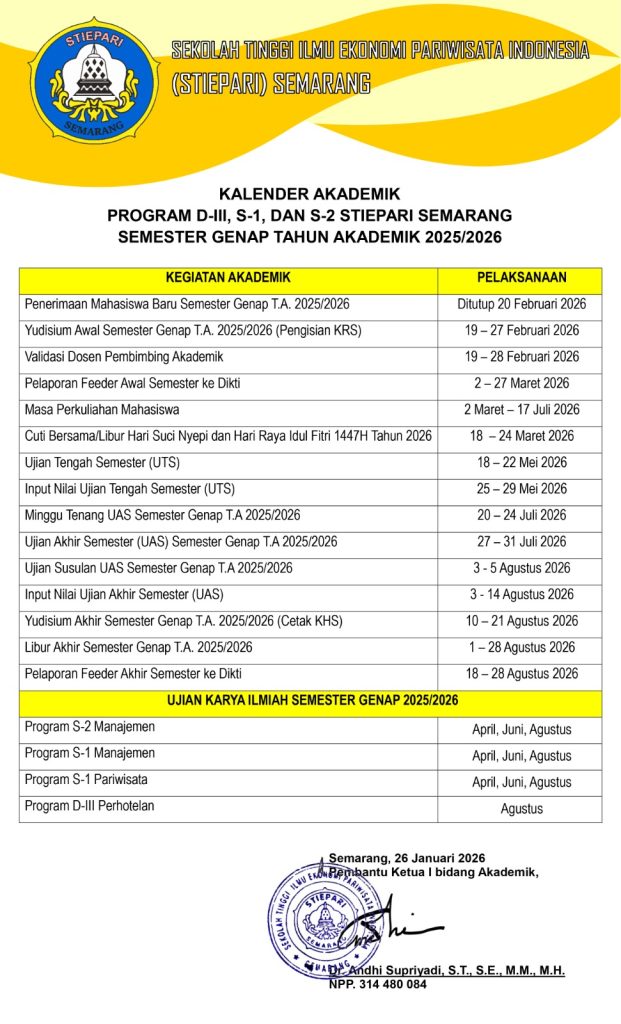 Pengumuman Akademik PENYERAGAMAN PENULISAN AFILIASI DAN PENGGUNAAN EMAIL INSTITUSI TATA ATURAN PENCETAKAN DAN PENYERAGAMAN KARYA ILMIAH MAHASISWA TATA ATURAN PELAKSANAAN UJIAN TUGAS AKHIR KETENTUAN CUTI KULIAH PENGUMUMAN KRS DAN KHS TATA TERTIB DAN KEDISIPLINAN MAHASISWA PENGUMUMAN LIBUR NASIONAL DAN CUTI BERSAMA HARI SUCI NYEPI TAHUN BARU SAKA 1947 DAN HARI RAYA IDUL FITRI TAHUN 1446 HIJRIAH