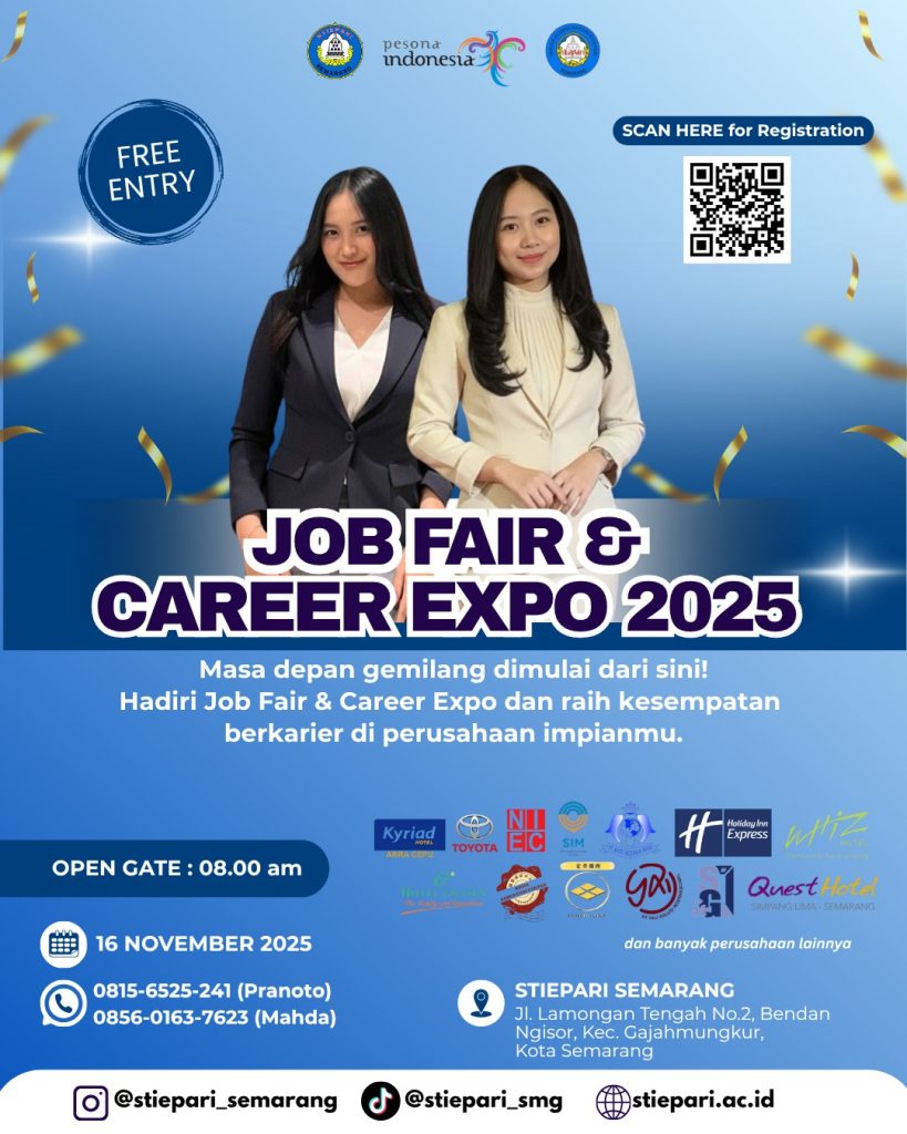 STIEPARI Semarang kembali membuka kesempatan besar bagi mahasiswa, alumni, dan masyarakat umum melalui Job Fair & Career Expo 2025 yang akan digelar pada 16 November 2025 di kampus STIEPARI Semarang, Jl. Lamongan Tengah No. 2, Bendan Ngisor, Gajahmungkur, Kota Semarang.